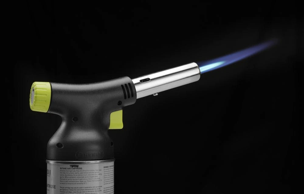 Von Robert Bronwasser für Köche entworfen. Dank des stilvollen mattschwarzen Designs mit grünen Akzenten und dem ergonomischen Griff ist es ein Genuss diesen Crème-Brûlée-Brenner in der täglichen Arbeit zu verwenden. Der Brenner ist einfach und sicher an der Gaskartusche befestigt und bedeckt die gesamte Oberseite der Kartusche. Die Piezo-Zündung macht das Zünden einfach, das große Gasdrehrad ermöglicht eine einfache Einstellung der Flammengröße und -intensität. Dieser Brenner kann in jedem Winkel betrieben werden, auch über Kopf, da das verbesserte Design des Brenners ein Flackern der Flamme verhindert.